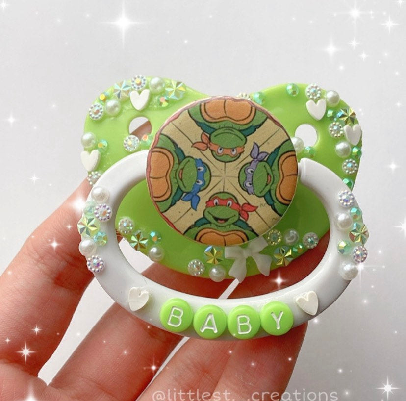 Deco adult pacifier available for remakes! this product will be made after ordering and could take 1 day to 2 weeks to complete at the very maximum! please dm me at @littlest._.creations for any questions!