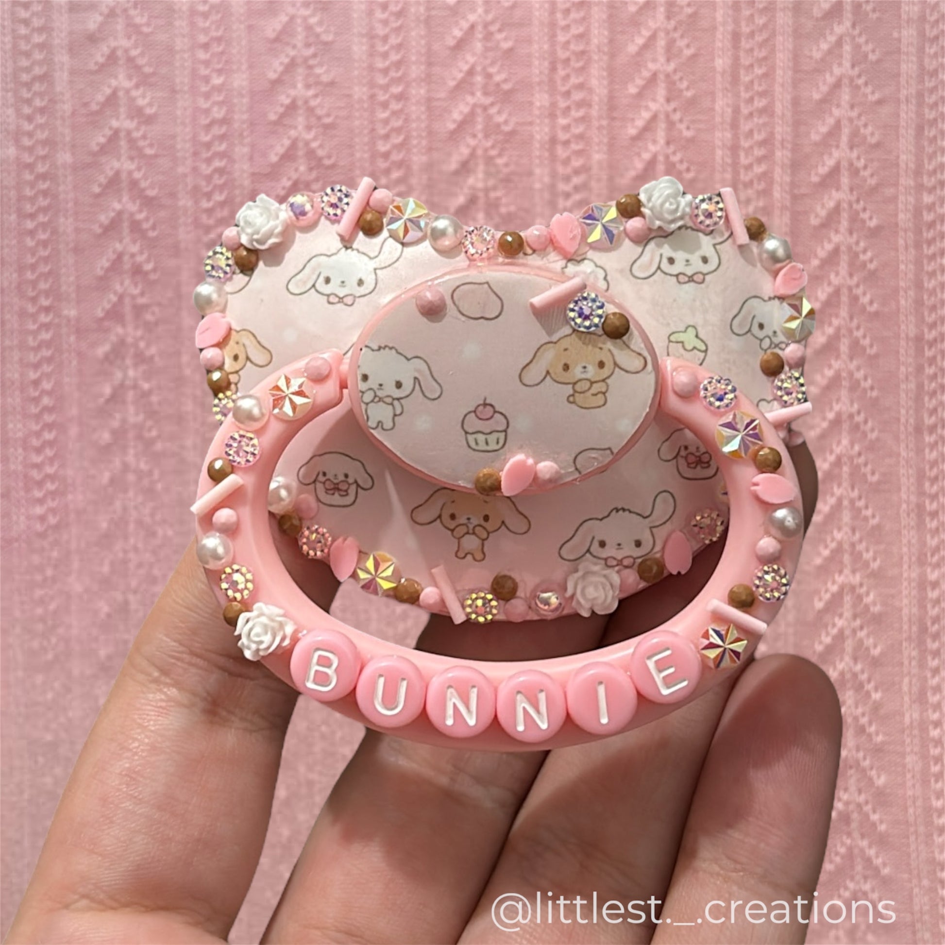 this paci is sealed with resin! Deco adult pacifier available for remakes! this product will be made after ordering and could take 1 day to 2 weeks to complete at the very maximum! please dm me at @littlest._.creations for any questions!