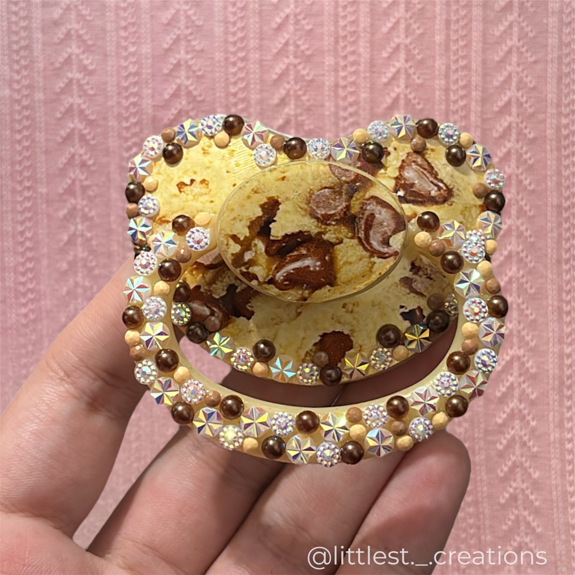 this paci is sealed with resin! Deco adult pacifier available for remakes! this product will be made after ordering and could take 1 day to 2 weeks to complete at the very maximum! please dm me at @littlest._.creations for any questions!