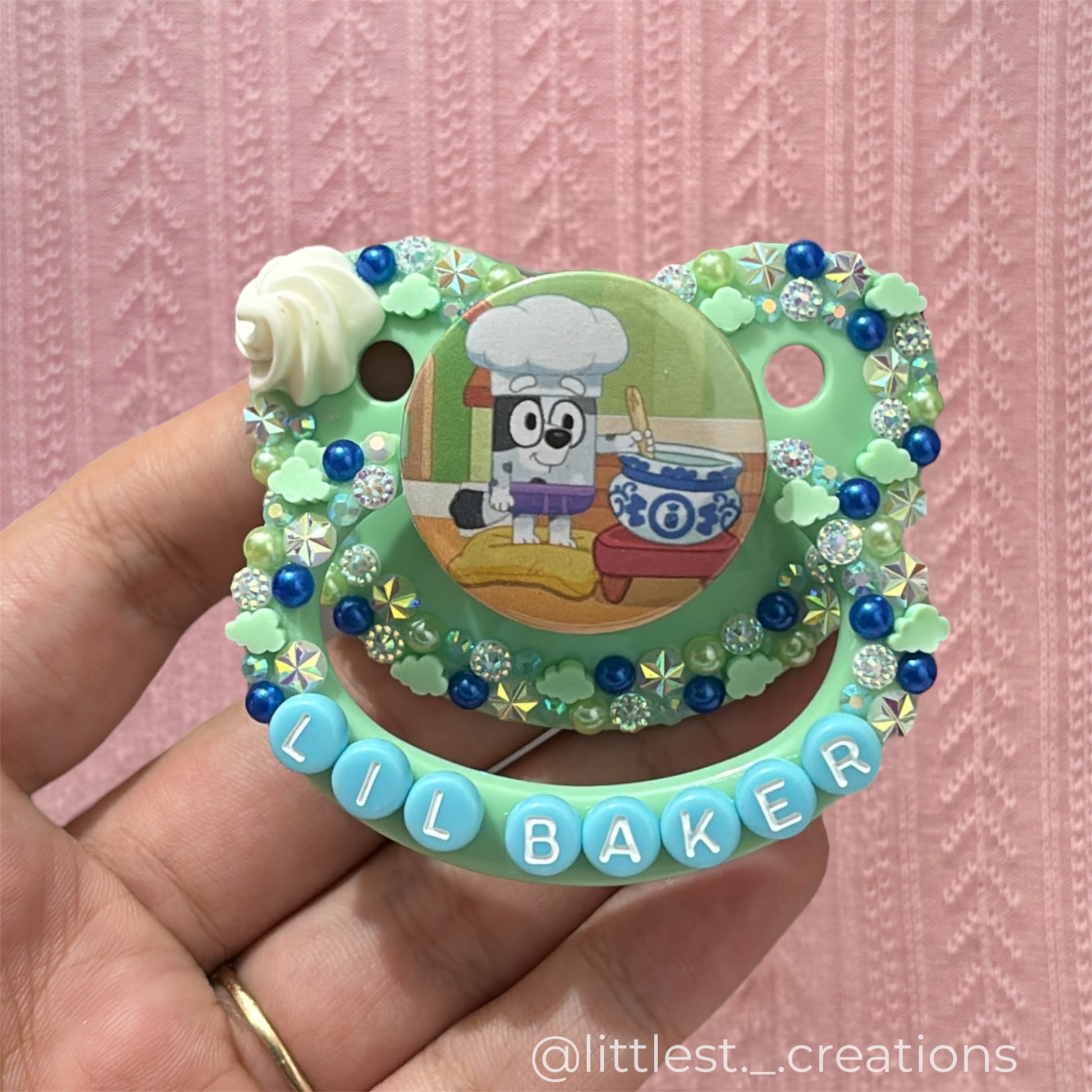 Deco adult pacifier available for remakes! this product will be made after ordering and could take 1 day to 2 weeks to complete at the very maximum! please dm me at @littlest._.creations for any questions!