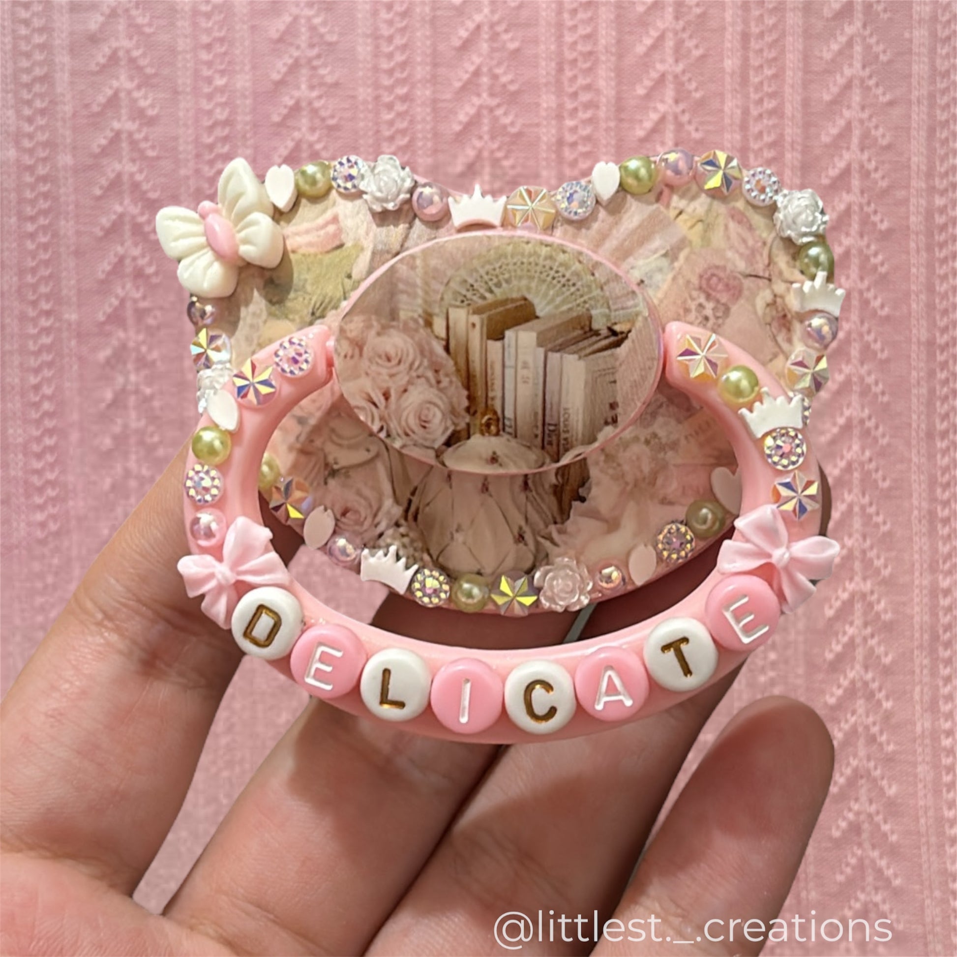 this paci is sealed with resin! Deco adult pacifier available for remakes! this product will be made after ordering and could take 1 day to 2 weeks to complete at the very maximum! please dm me at @littlest._.creations for any questions!