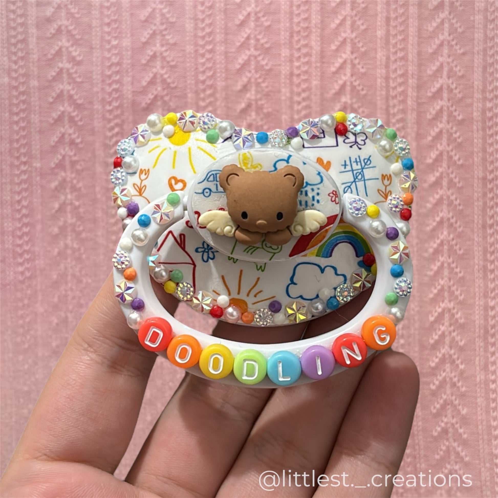 this paci is sealed with resin! Deco adult pacifier available for remakes! this product will be made after ordering and could take 1 day to 2 weeks to complete at the very maximum! please dm me at @littlest._.creations for any questions!