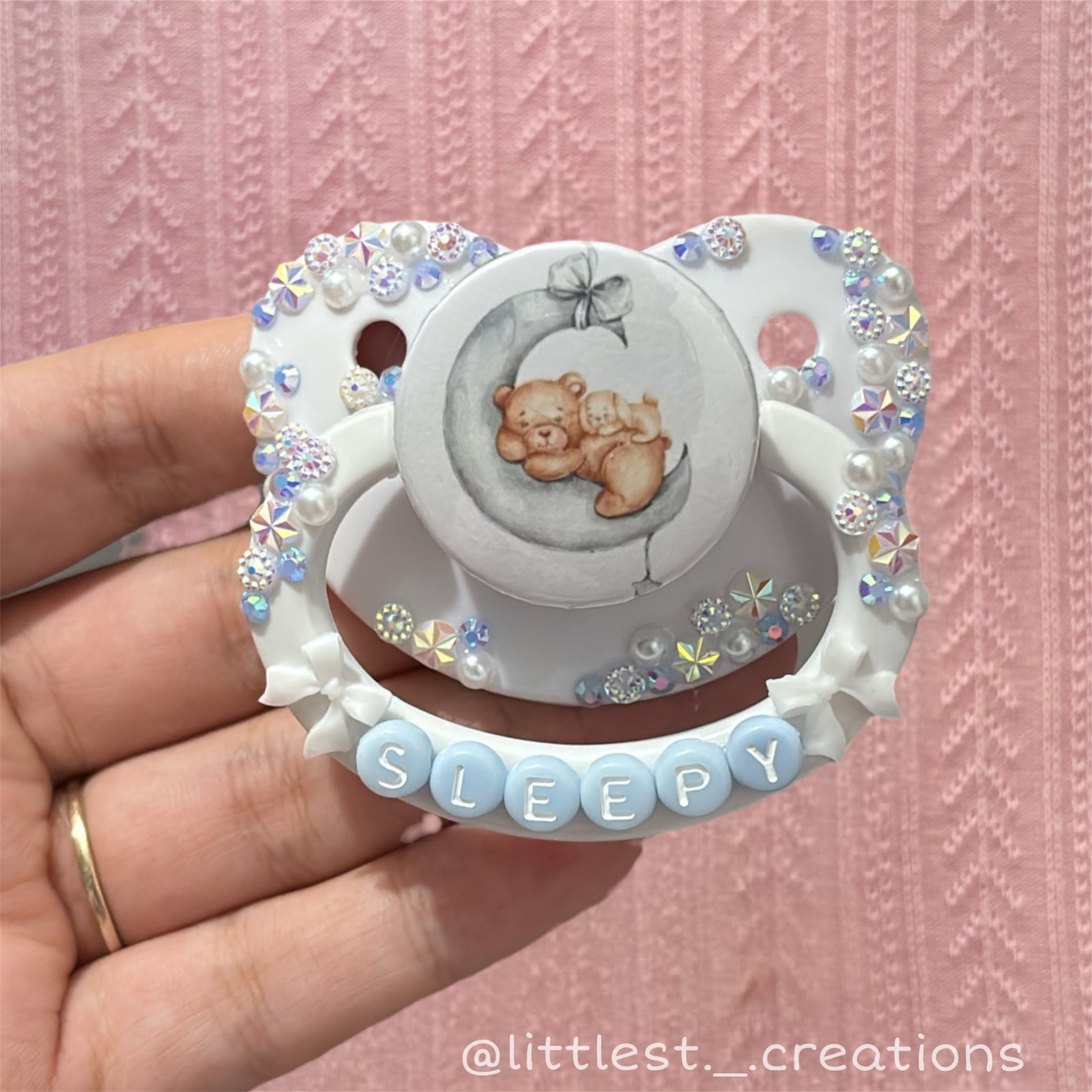 Deco adult pacifier available for remakes! this product will be made after ordering and could take 1 day to 2 weeks to complete at the very maximum! please dm me at @littlest._.creations for any questions!