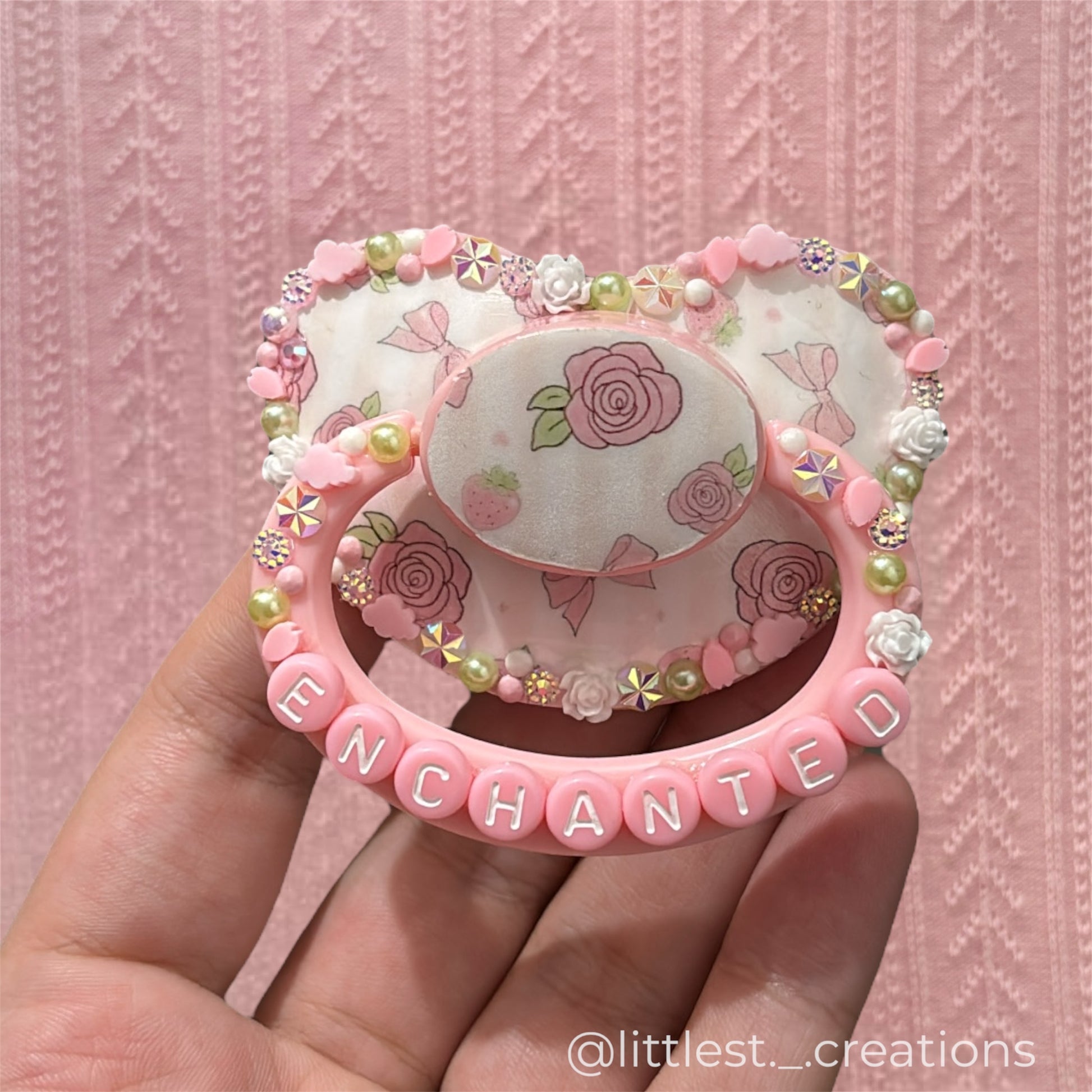 this paci is sealed with resin! Deco adult pacifier available for remakes! this product will be made after ordering and could take 1 day to 2 weeks to complete at the very maximum! please dm me at @littlest._.creations for any questions!