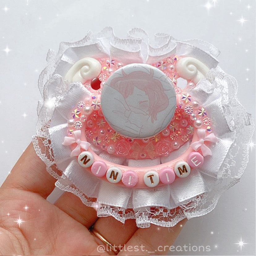 Deco adult pacifier available for remakes! this product will be made after ordering and could take 1 day to 2 weeks to complete at the very maximum! please dm me at @littlest._.creations for any questions!