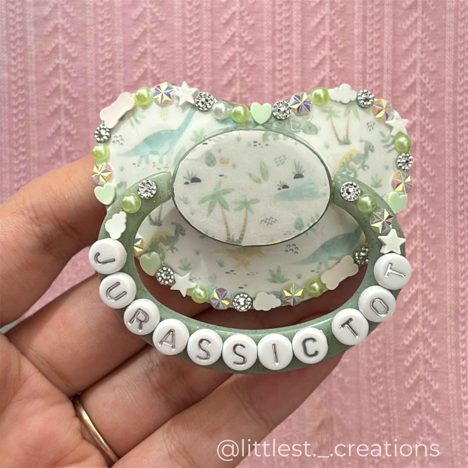 this paci is sealed with resin! Deco adult pacifier available for remakes! this product will be made after ordering and could take 1 day to 2 weeks to complete at the very maximum! please dm me at @littlest._.creations for any questions!