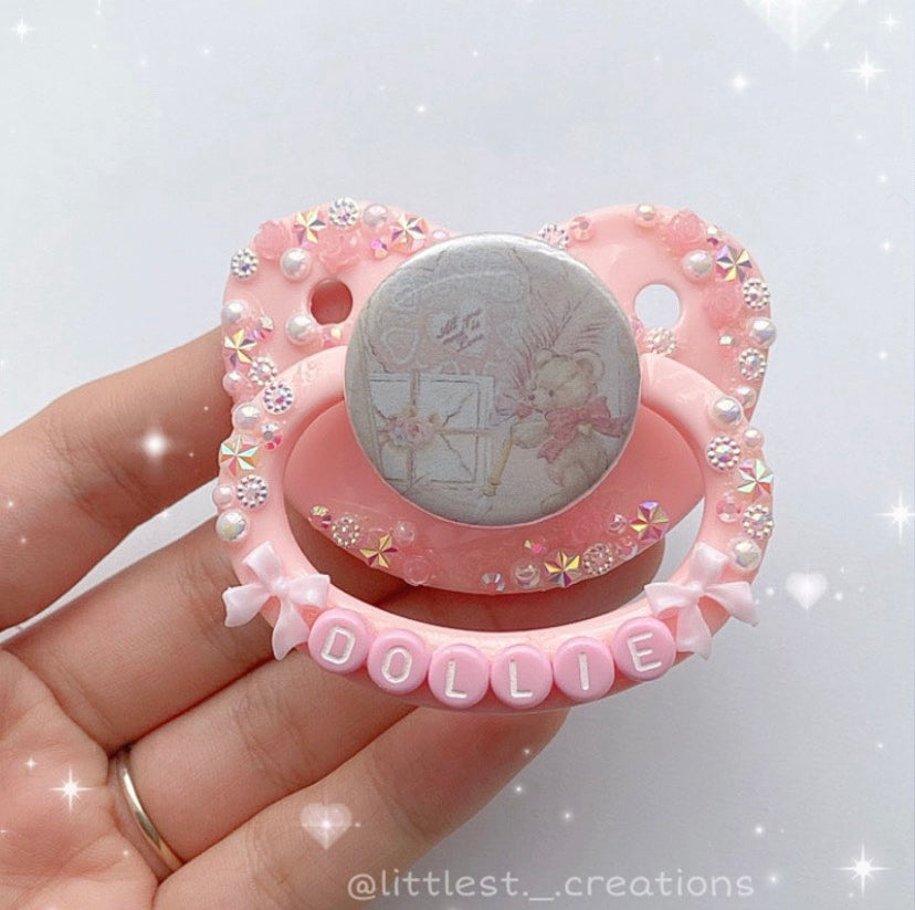 Deco adult pacifier available for remakes! this product will be made after ordering and could take 1 day to 2 weeks to complete at the very maximum! please dm me at @littlest._.creations for any questions!