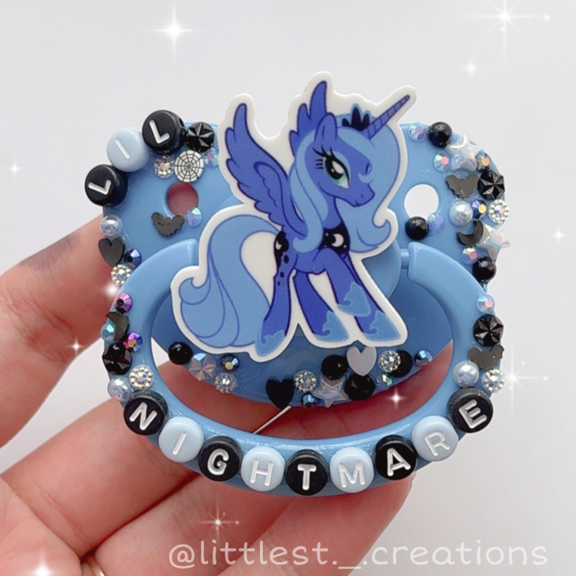 Deco adult pacifier available for remakes! this product will be made after ordering and could take 1 day to 2 weeks to complete at the very maximum! please dm me at @littlest._.creations for any questions!