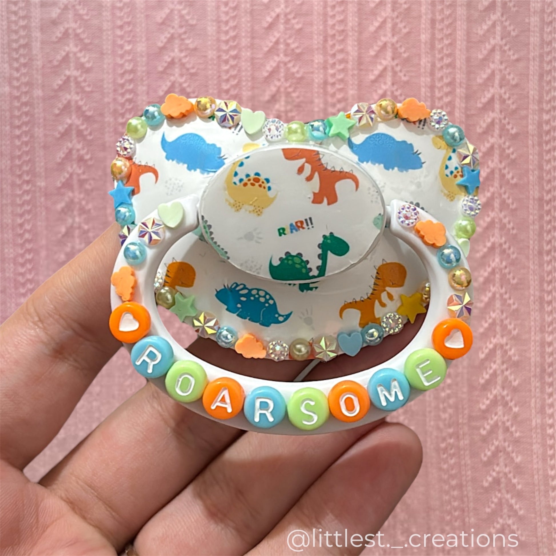 this paci is sealed with resin! Deco adult pacifier available for remakes! this product will be made after ordering and could take 1 day to 2 weeks to complete at the very maximum! please dm me at @littlest._.creations for any questions!