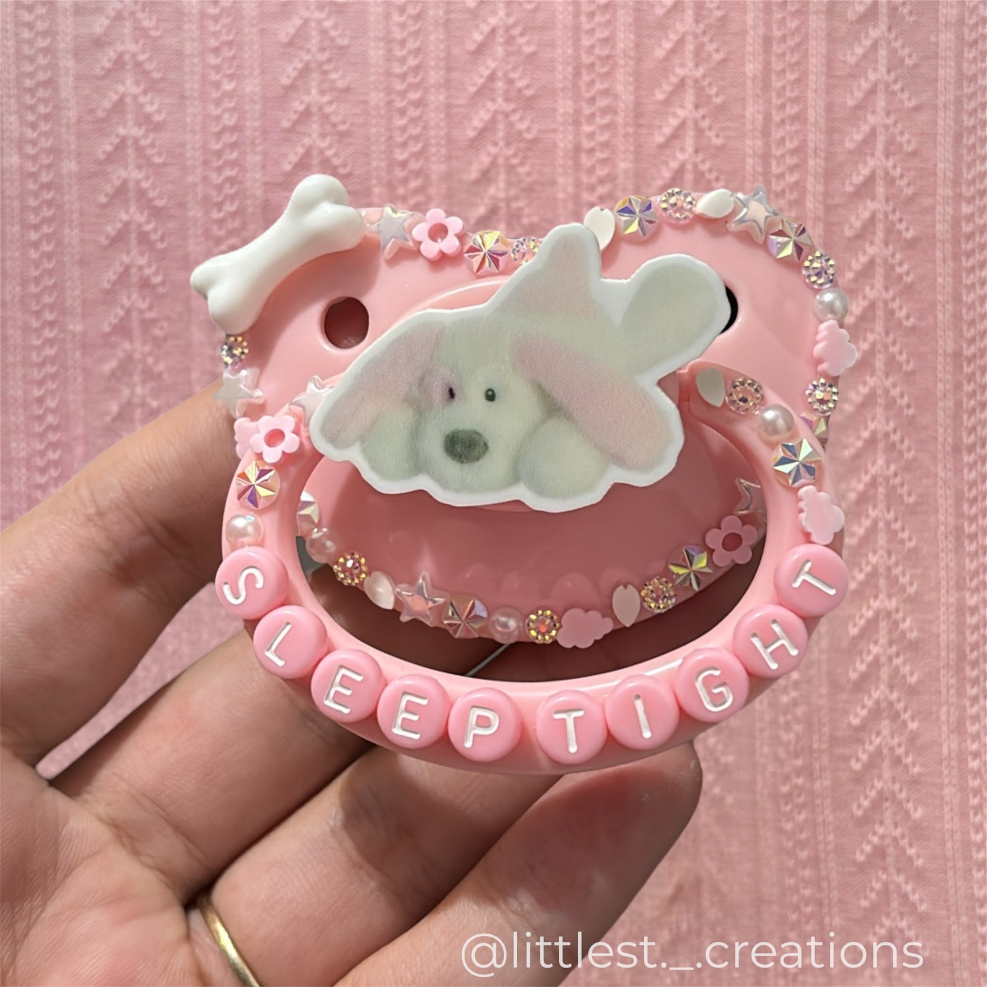Deco adult pacifier available for remakes! this product will be made after ordering and could take 1 day to 2 weeks to complete at the very maximum! please dm me at @littlest._.creations for any questions!