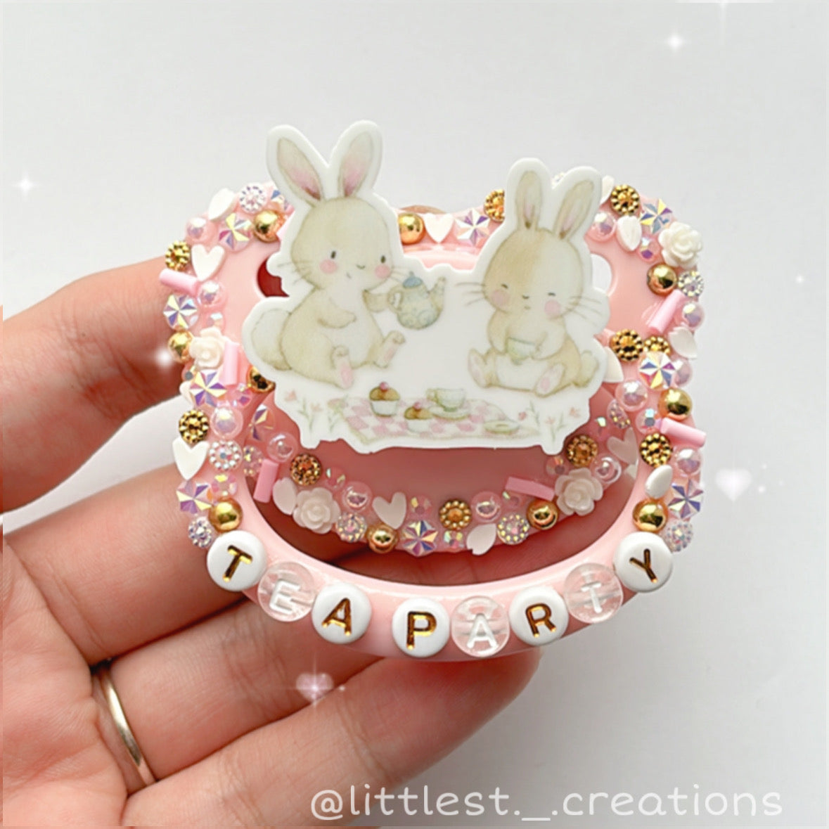 Disclaimer! when ordering a remake paci with charms or mixed bases, please leave a note if you’d like it to be absolutely exact which means i will need extra time to order charms i do not have ext which may take 1-3 weeks longer! If you’re okay with a remake which the same wording, same deco, same center, same colour scheme but maybe the handle and base colours being swapped or similar themed charms, there’s no need to leave a note!