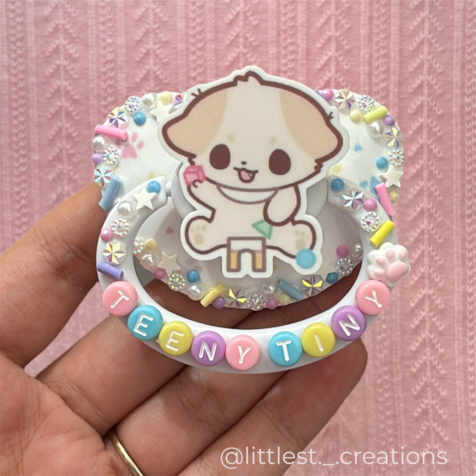 this paci is sealed with resin! Deco adult pacifier available for remakes! this product will be made after ordering and could take 1 day to 2 weeks to complete at the very maximum! please dm me at @littlest._.creations for any questions!