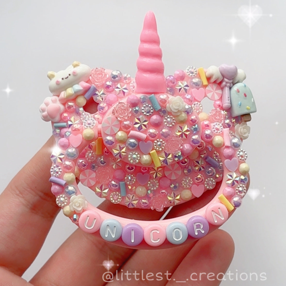 Disclaimer! when ordering a remake paci with charms or mixed bases, please leave a note if you’d like it to be absolutely exact which means i will need extra time to order charms i do not have ext which may take 1-3 weeks longer! If you’re okay with a remake which the same wording, same deco, same center, same colour scheme but maybe the handle and base colours being swapped or similar themed charms, there’s no need to leave a note!